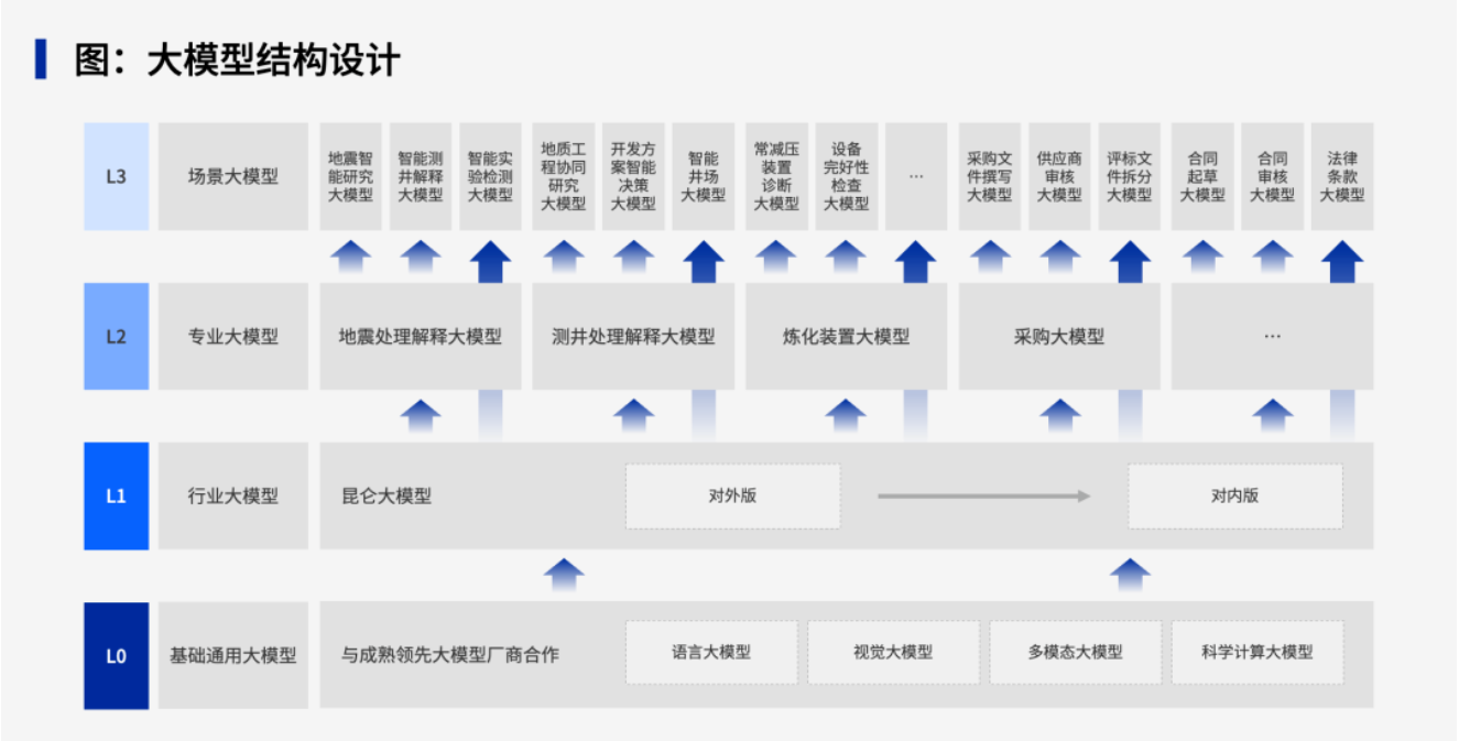 参考业内通常大模型构建方式,结合中国石油业务特点,中国石油将大模型设计为四层架构: