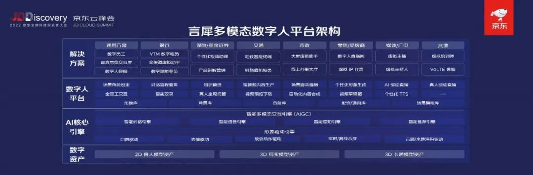 在这次大会上,言犀还发布了言犀多模态数字人平台。与业内其他厂商发布的数字人不同,京东云给它的定位是“产业服务型”数字人,其核心优势就是服务与交互。