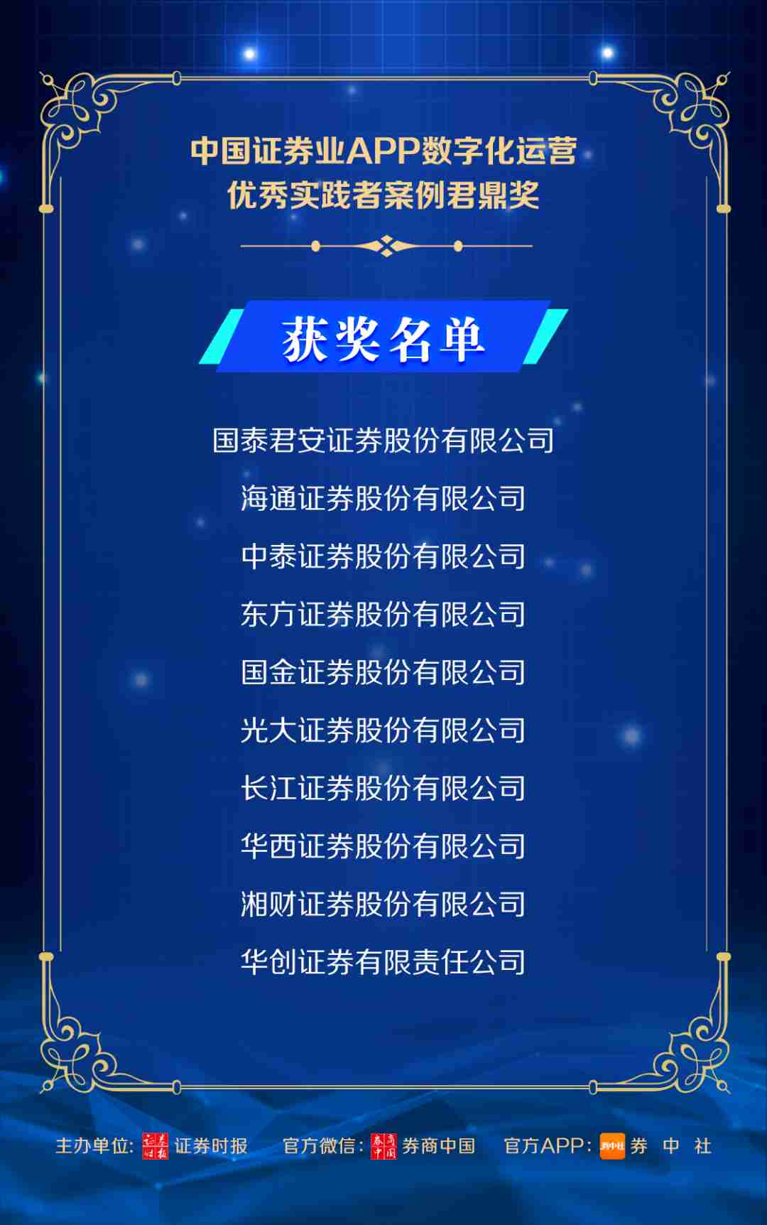 “The First Junding Award Selection of China Securities Industry Digital Transformation” has eight awards in three categories: “Junding Award of China Securities Industry Digital Transformation Comprehensive Category”, “Junding Award of China Securities Industry Digital Transformation APP” and “Junding Award of China Securities Industry Digital Practice Case”.