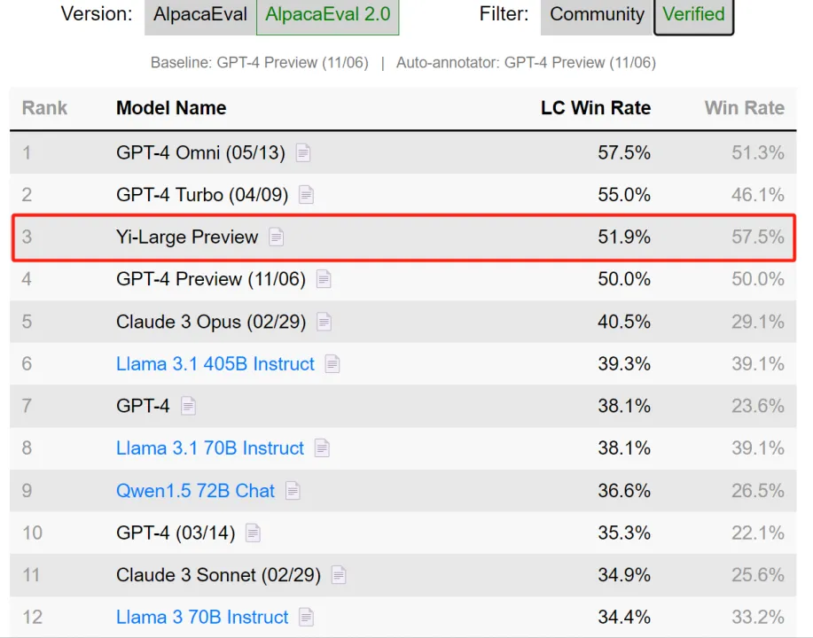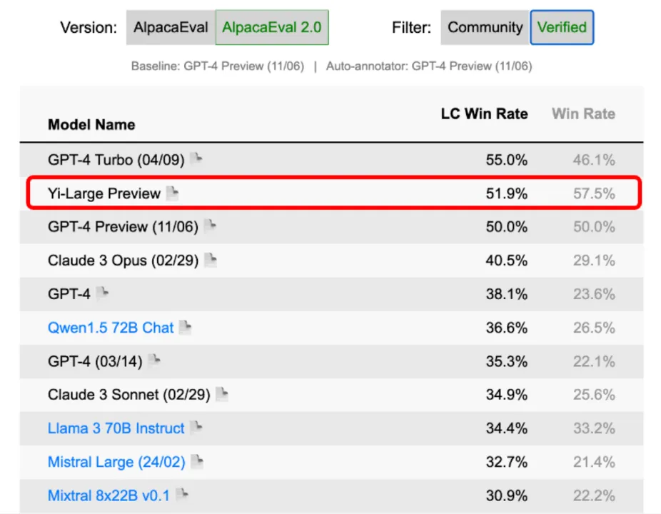在最新的 AlpacaEval 2.0模型排行榜中, Yi-Large 模型的英语能力主要指标 LC Win Rate依然排到了世界第三。