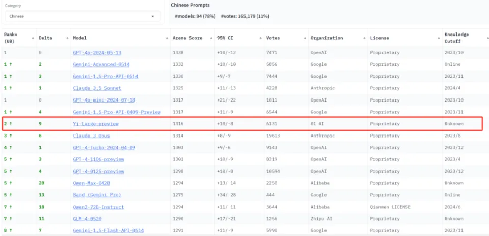 在 LMSYS 盲测竞技场最新排名中,零一万物的最新千亿参数模型 Yi-Large 总榜排名世界模型第14(刚发布时排名世界模型第 7),中国大模型中第1,排于其前面的仅有OpenAI、Anthropic、Google、Meta、NexusFlow的大模型;其中文分榜排名第7位(刚发布时排名世界模型第1)。