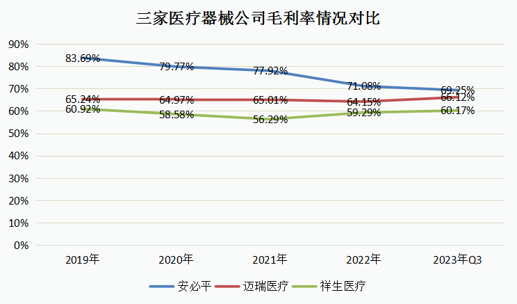 截至2023年三季度,安必平公司的毛利率为69.25%,就明显高于迈瑞医疗和祥生医疗,且最近几年毛利率下滑和自产产品无关,主要是外购的贸易类销售业务增加,这才拉低了公司整体毛利率。