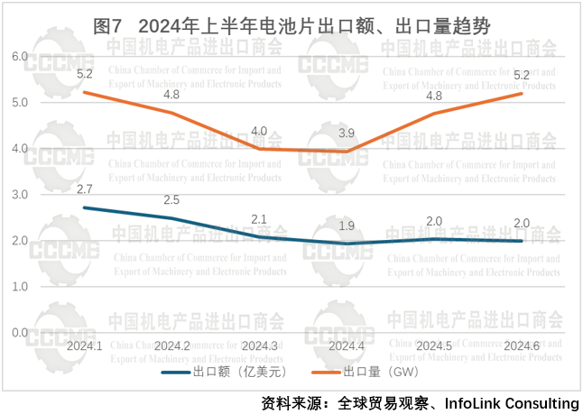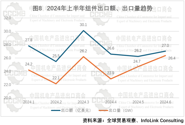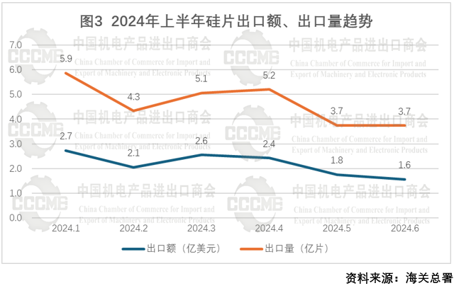 2024年上半年,我国光伏产品出口额为187.3亿美元,同比下降35.2%。其中,光伏硅片出口额为10.9亿美元,同比下降59.3%,出口量为27.4亿片,同比下降18.2%;光伏电池片出口额为13.2亿美元,同比下降47.6%,出口量为27.9GW,同比增长38.7%;光伏组件出口额为163.2亿美元,同比下降31.1%,出口量为146.5GW,同比增长33.7%。2024年上半年我国光伏电池片、组件出口继续延续2023年量增价跌态势。