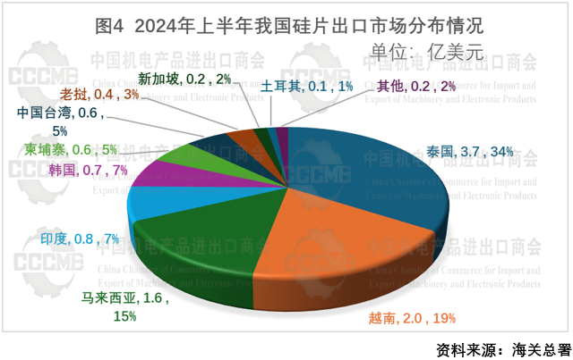 截至2024年上半年,我国光伏硅片出口额、出口量相比2024年初降幅均超40%,主要出口市场仍为泰国、越南、马来西亚等东南亚国家。上半年硅片出口价格同比下降约70%。