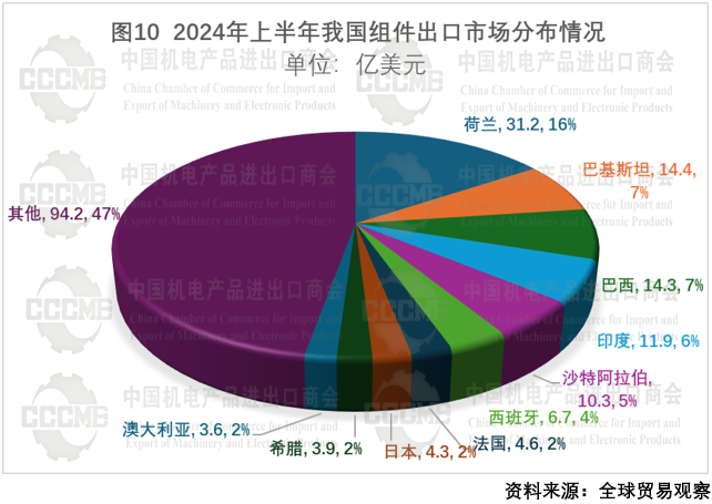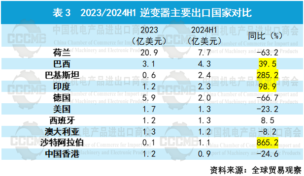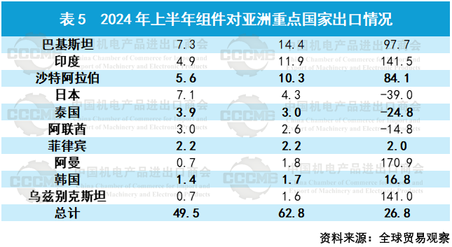 2024年上半年,我国光伏产品对亚洲国家出口额为87.4亿美元,同比下降13.2%,其中组件对亚洲国家出口额为62.8亿美元,同比增长26.8%,出口量约56GW,同比增长约140%。从出口目的地看,巴基斯坦、印度等南亚地区国家以及沙特阿拉伯等中东地区国家受其可再生能源装机需求以及政策影响,光伏组件需求大幅提升。 数字化转型网(www.szhzxw.cn)