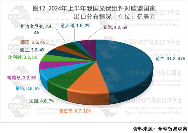 2024年上半年,我国光伏产品对欧盟国家出口额为67.1亿美元,同比下降49.7%,占光伏产品总出口额的35.4%,同比下滑约10个百分点,份额下降主要受巴基斯坦、沙特阿拉伯等新兴市场崛起和欧洲剩余光伏组件库存等因素影响。 数字化转型网(www.szhzxw.cn)