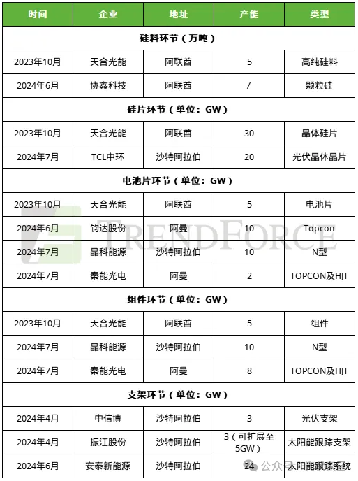 据 TrendForce 集邦咨询新能源研究中心不完全统计,截至目前,已有天合光能、协鑫科技、TCL 中环、钧达股份、晶科能源、秦能光电、中信博、振江股份、安泰新能源等 9 家中国光伏企业规划在中东布局产能。这些产能的产地主要集中在阿联酋、沙特阿拉伯、阿曼这三个国家,涉及硅料、硅片、电池片、组件以及支架等多个环节,几乎涵盖了整个光伏产业链。从已公布的产能规模来看,硅料产能达到 5 万吨,硅片产能为 50GW,电池片产能为 27GW,组件产能为 23GW,支架产能约为 30GW。