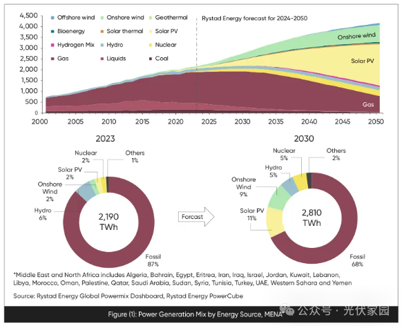根据中东光伏产业协会(MESIA)发布的《2024 年光伏展望报告》,来分析中东和北非地区的发电来源。