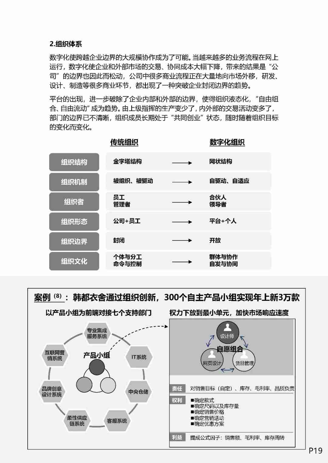 平台的出现,进一步破除了企业内部和外部的边界,使得组织液态化,”自由组合、自由流动”成为趋势。由上级指挥的生产变少了,内外部的交易活动变多了, 部门的边界已不清晰,组织成员长期处于共同创业状态,随时随着组织目标的变化而变化。