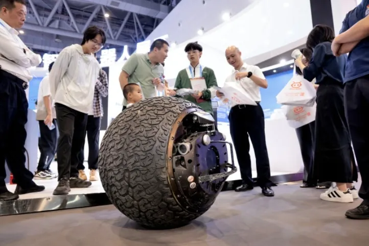 在展区通道滚动的一款球形机器人,凭借少见的球形吸引了大家的目光。这是由逻腾(杭州)科技有限公司(以下简称“逻腾科技”)打造的水陆两栖机器人,名叫“铁蛋”。