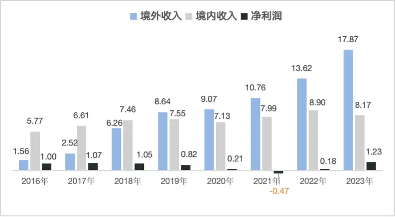 从笔者整理该公司公开披露信息材料所知:公司的境外收入来源于出口贸易,在美国和德国成立了销售子公司。