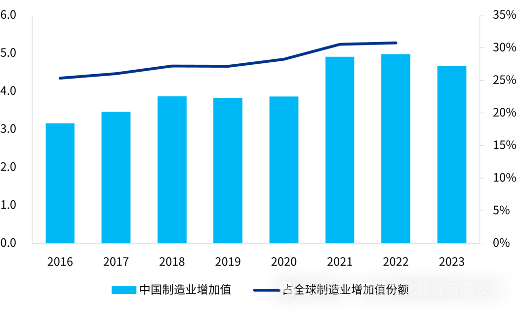 图1:中国制造业规模及占全球份额,万亿美元(左轴),%(右轴)