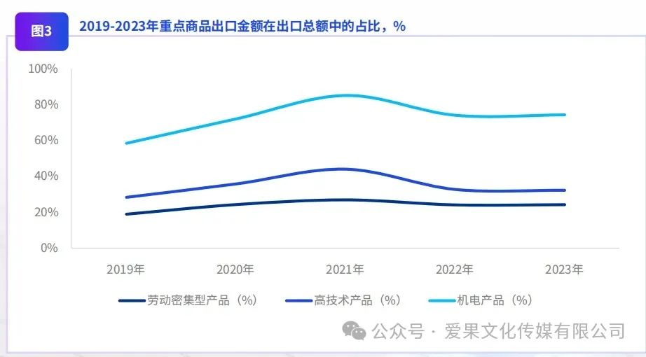 中国的出口产品结构正在优化,机电产品和高技术产品的出口占比快速上升,而劳动密集型产品的出口占比在下降。
