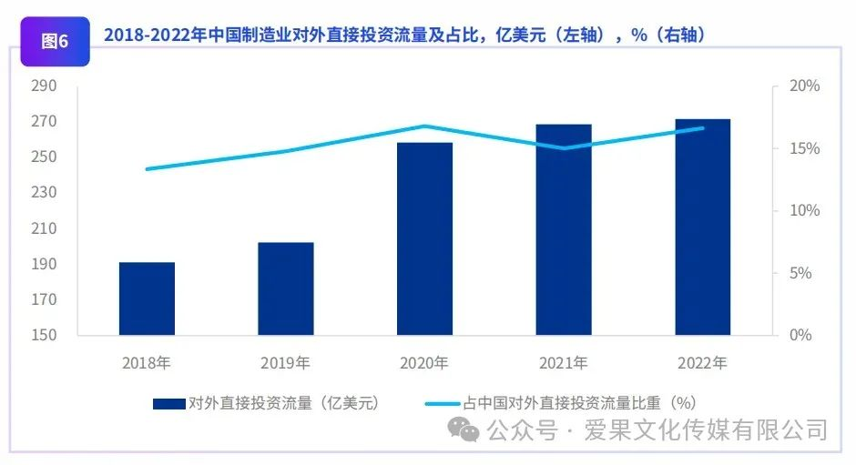 图:2018-2022年中国制造业对外直接投资流量及占比
