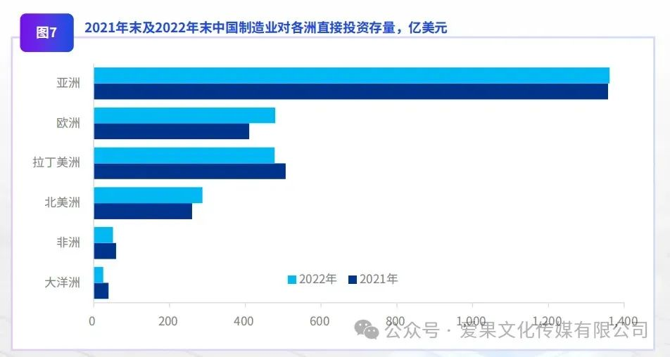 图:2021年末及2022年末中国制造业对各洲直接投资存量