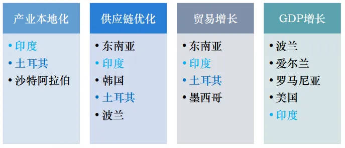 – 东南亚国家(如越南、马来西亚、泰国)、印度、土耳其和墨西哥是优先考虑的区域,这些地区可以通过投资设厂来替代直接出口,降低贸易成本和规避贸易壁垒。