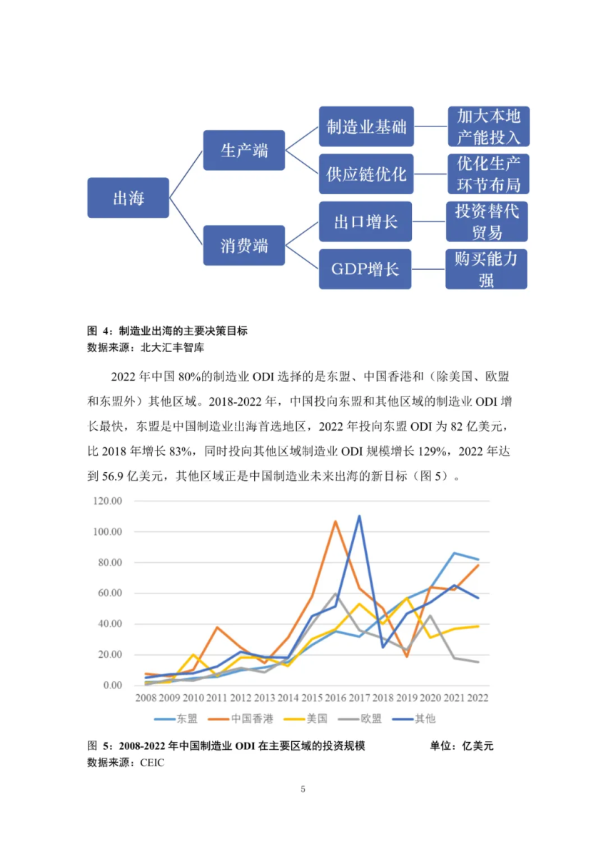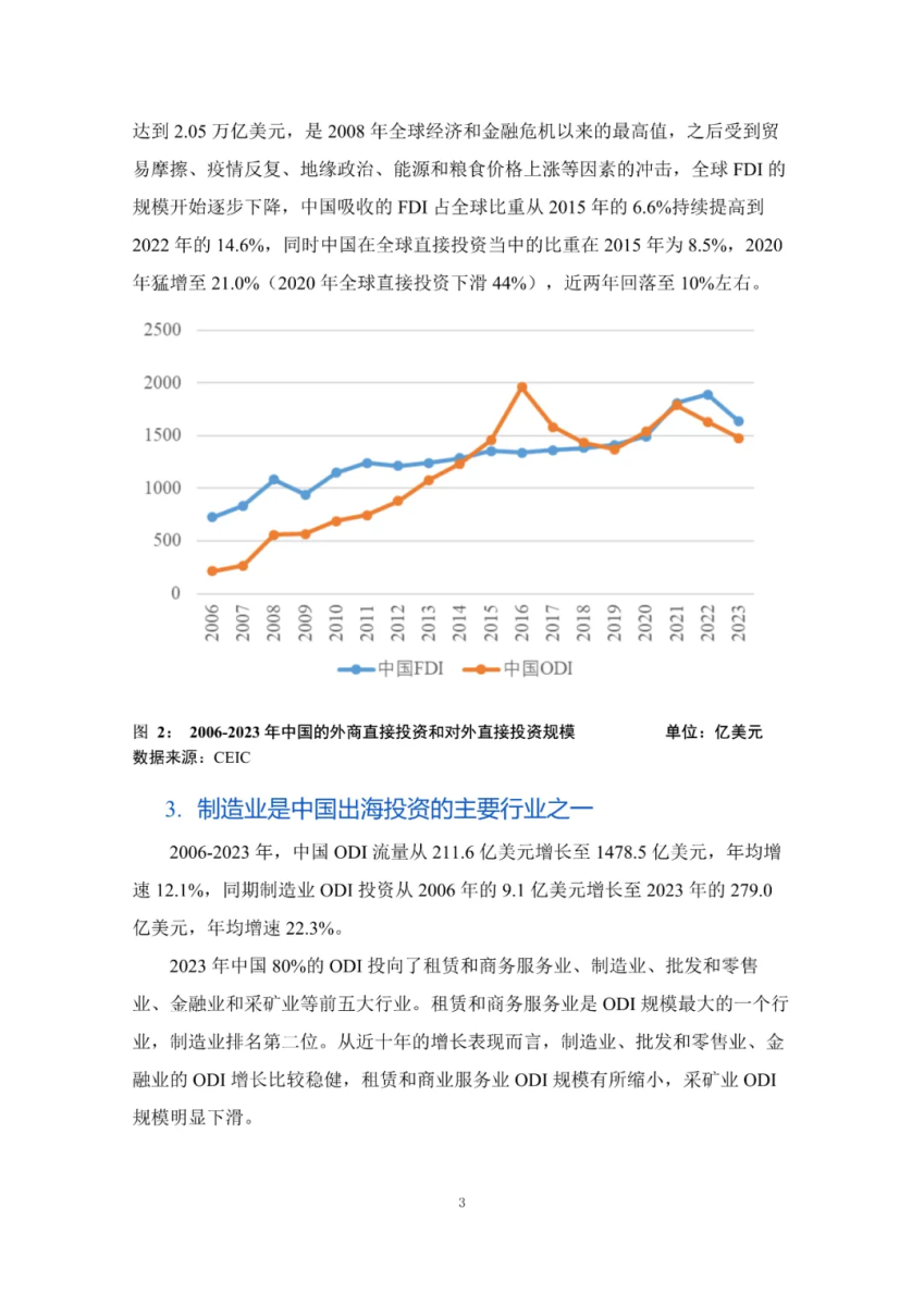 2023 年中国 80%的 ODI投向了租赁和商务服务业、制造业、批发和零售业、金融业和采矿业等前五大行业。租赁和商务服务业是 ODI规模最大的一个行业,制造业排名第二位。从近十年的增长表现而言,制造业、批发和零售业、金融业的 ODI增长比较稳健,租赁和商业服务业 ODI规模有所缩小,采矿业 ODI规模明显下滑。