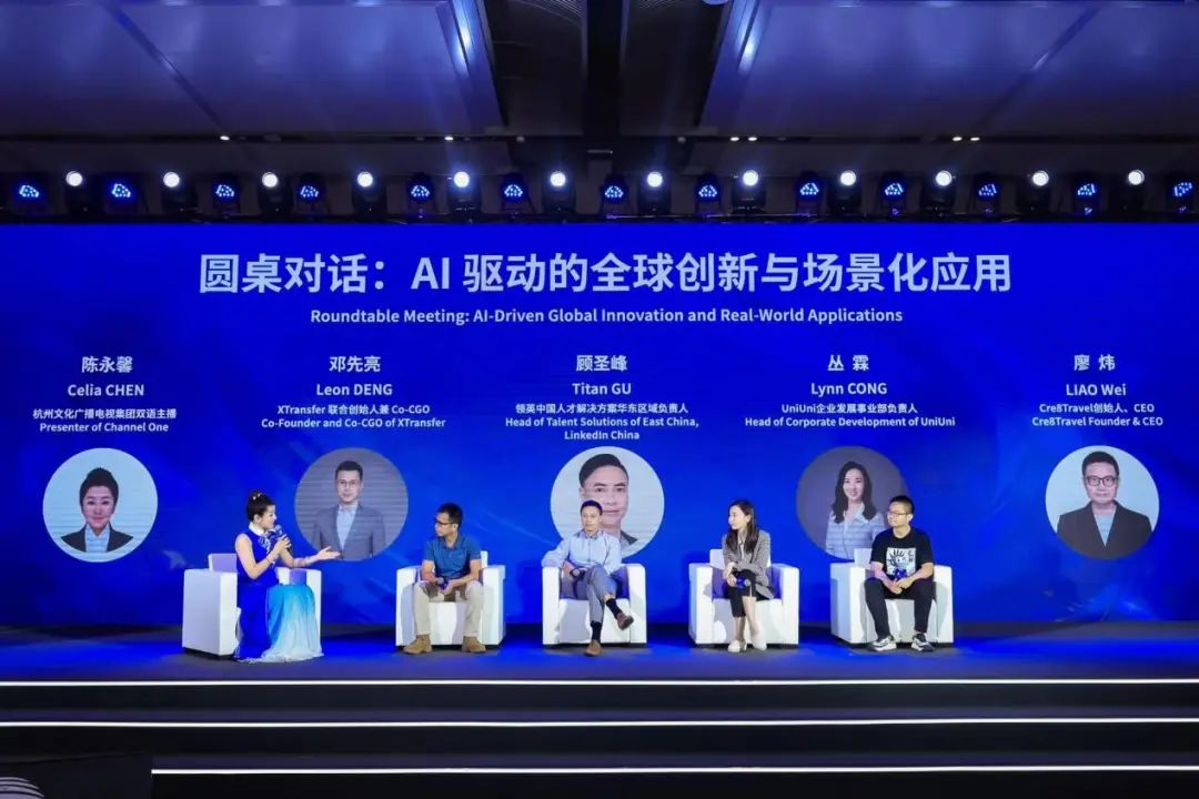 本次活动的圆桌对话环节由杭州文化广播电视集团双语主播陈永馨主持,XTransfer联合创始人&Co-CGO邓先亮,领英中国人才解决方案华东区域负责人顾圣峰,UniUni企业发展事业部负责人丛霖,Cre8Travel创始人、CEO廖炜参与对话。