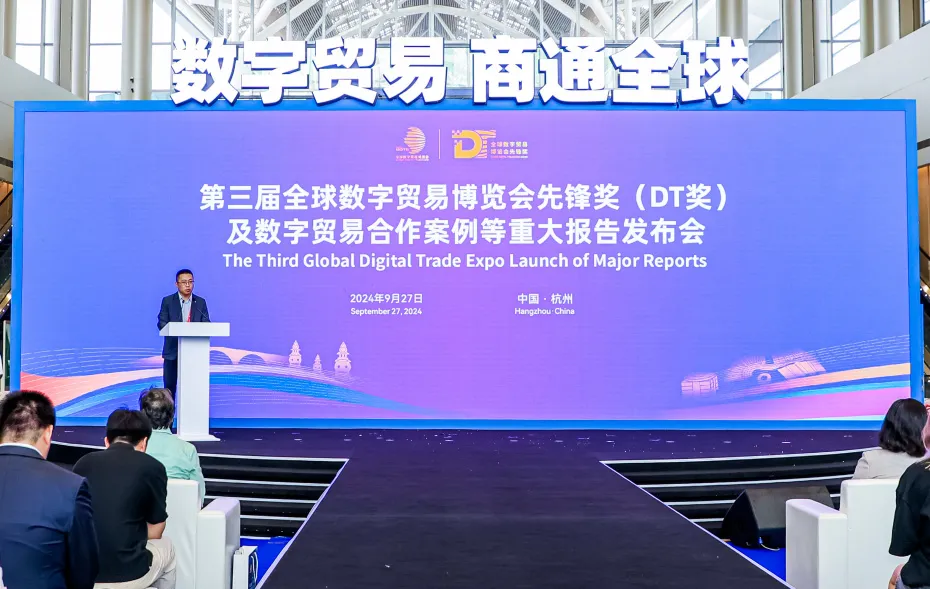 9月27日上午,第三届全球数字贸易博览会先锋奖(DT奖)及数字贸易合作案例等重大报告发布会在杭州大会展中心成功举办。发布会上发布了《第三届全球数字贸易博览会数字贸易发展合作案例集》《数字贸易指数2024》《2024浙江开放指数》《2024浙江省数字贸易百强榜》《2024浙江数字贸易创新应用优秀案例》,向第二批浙江省数字贸易标准化试点基地授牌,颁发第三届全球数字贸易博览会先锋奖(DT奖)。