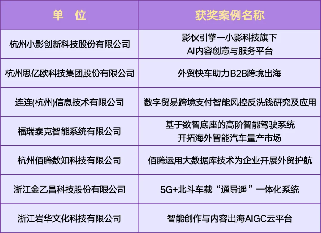 今年3月,“2024浙江省数字贸易创新应用优秀案例”评选活动启动,期间共收到申报案例70余个,其中包含AIGC、人工智能技术的应用等前沿热点领域和物联网、5G通讯、大数据等最新应用实践。参评案例经智库专家评审及公示,最终评定一等奖4名、二等奖7名、三等奖12名。这是浙江第四次发布数字贸易创新应用优秀案例。现场视频发布了《2024浙江数字贸易创新应用优秀案例》,浙江省商务厅副厅长胡真舫为获得优秀案例一等奖的单位颁奖。