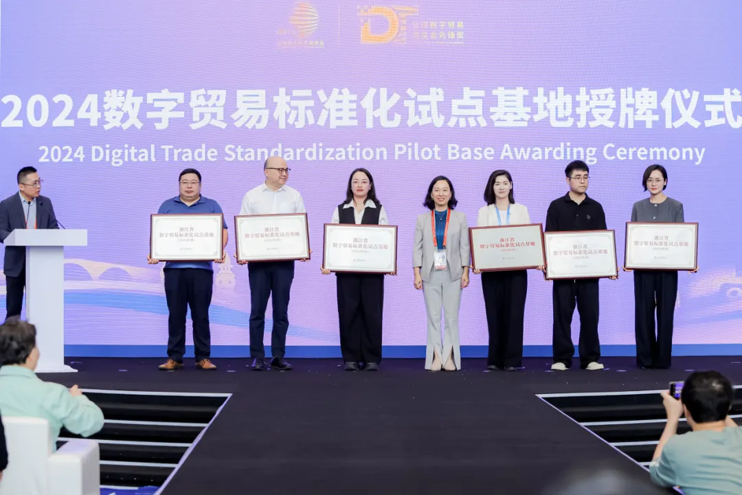 近年来,浙江积极参与全球数字贸易规则标准构建,在数字贸易标准化建设中推动多个全国首创,从成立全国首个数字贸易标准化技术委员会,到开展数字贸易标准化试点基地建设,再到全国首个数字贸易行业标准立项研制,均取得了显著成果。今年5月,浙江省开展新一轮基地申报工作,经多轮评审,共认定第二批6个浙江省数字贸易标准化试点基地。浙江省商务厅副厅长胡真舫现场为6个基地进行了授牌。
