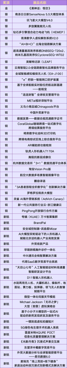 本届DT奖自8月10日正式启动以来,共收到来自中国、中国香港、美国、英国、日本、马里等多个国家(地区)超200个参评项目,所有项目展品均在数贸会现场展览展示。DT奖评审委员会由国内数字贸易领域的权威专家组成,围绕数字贸易五大类,“创新前沿、市场前景、贸易情况、社会影响、数智双碳”等五个维度,经线上答辩、集中评审、复审三轮,共有54个项目入围公示,最终评选出了金奖1个,银奖11个,铜奖21个,新锐奖21个。此外,今年还专门为6家在数贸会组织和筹备过程中表现出色的单位颁发最佳组织奖。