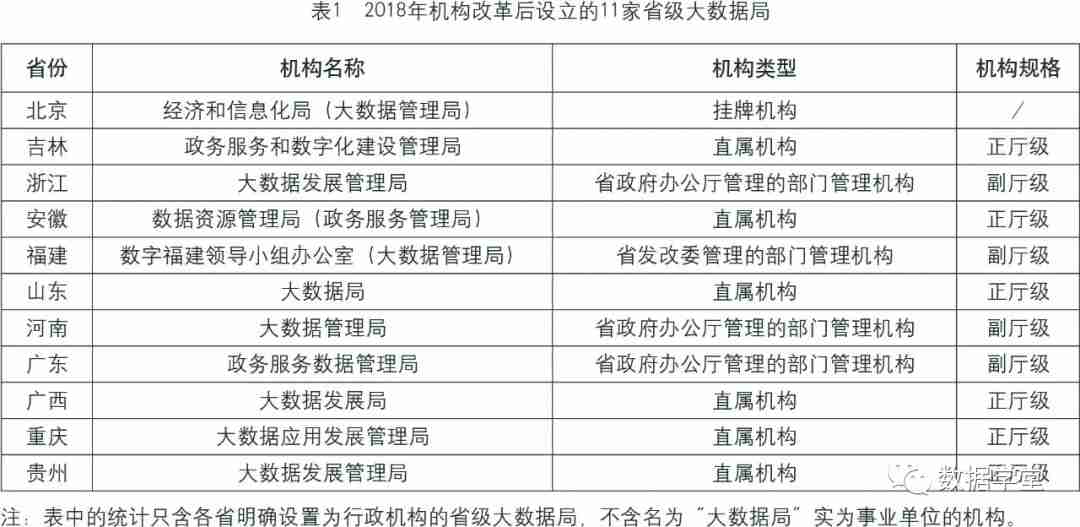 本文重点分析的省级大数据局是机构改革后明确列入省级党政机构序列的行政机构,实际上全国还有一些省份将大数据局设置为省政府直属事业单位或部门管理的事业单位。