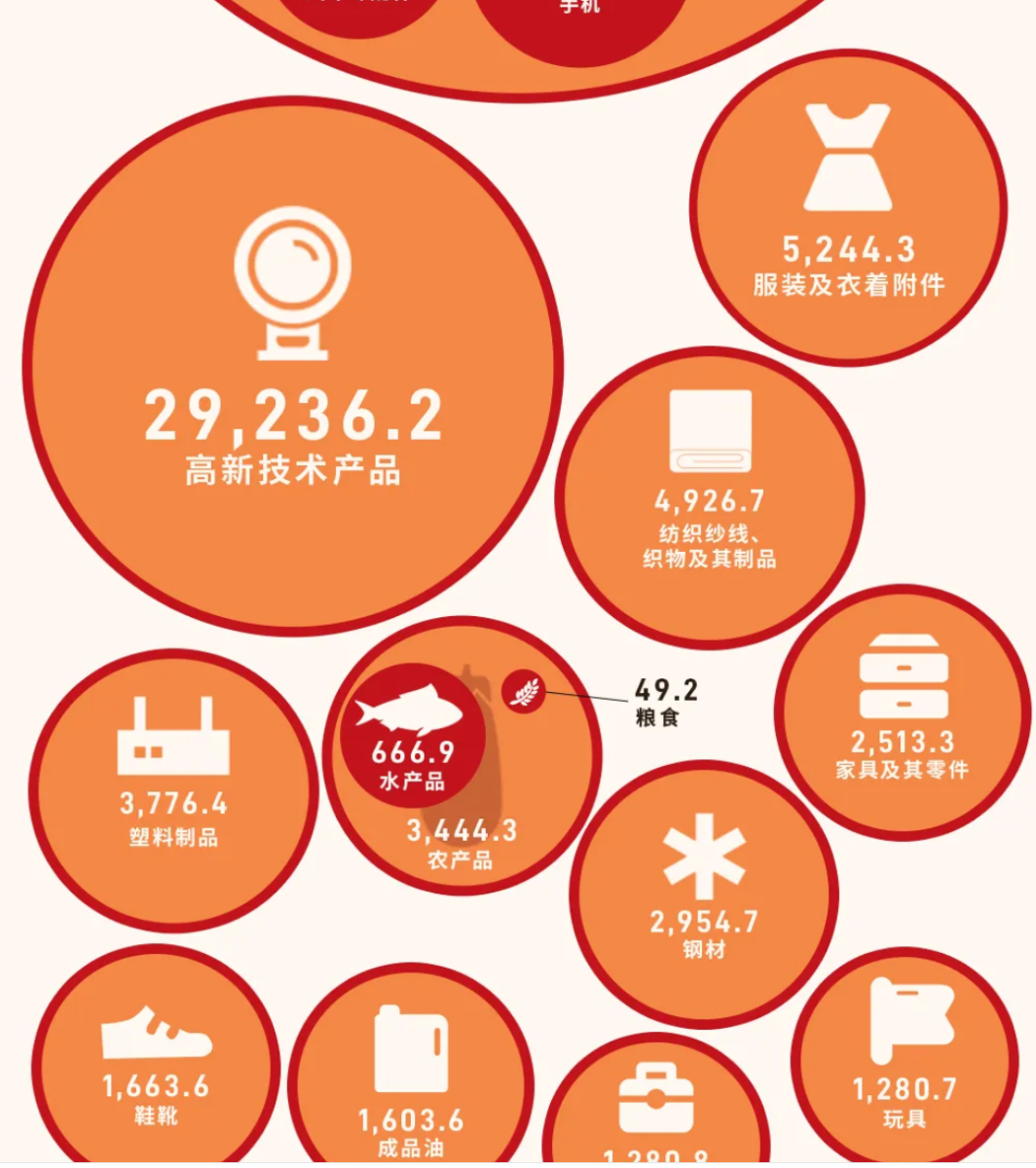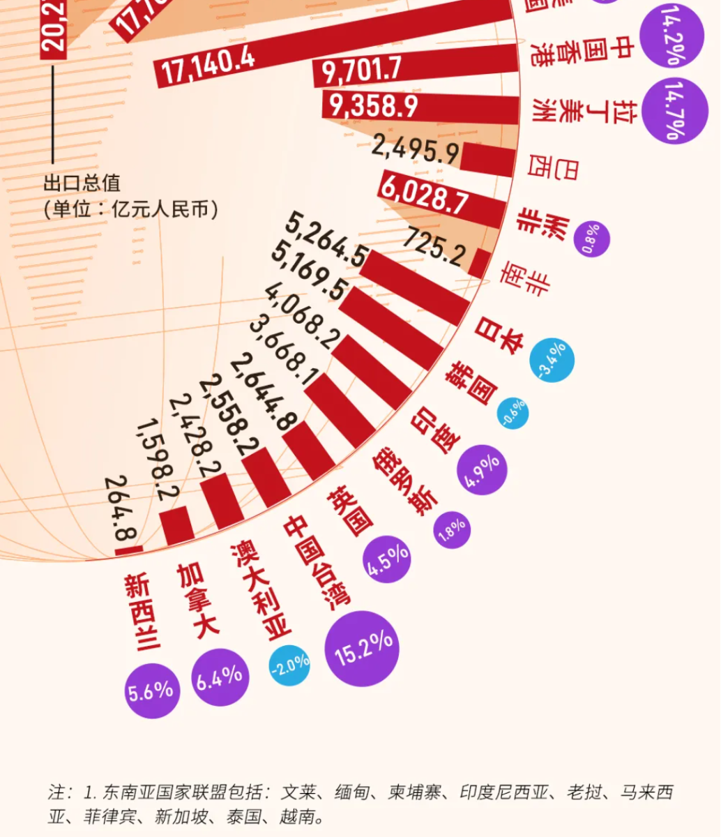 随着区域全面经济伙伴关系协定(RCEP)的生效,东南亚地区成为出口的新热点。而从欧盟:美国等发达经济体较高的出口总值,也可见多元化市场布局的成效。以下列出的主要国别(地区)出口商品总值达到10.79万亿元,占据上半年出口商品总值(12.13万亿元)近九成,基本代表我国出口的重点地区。