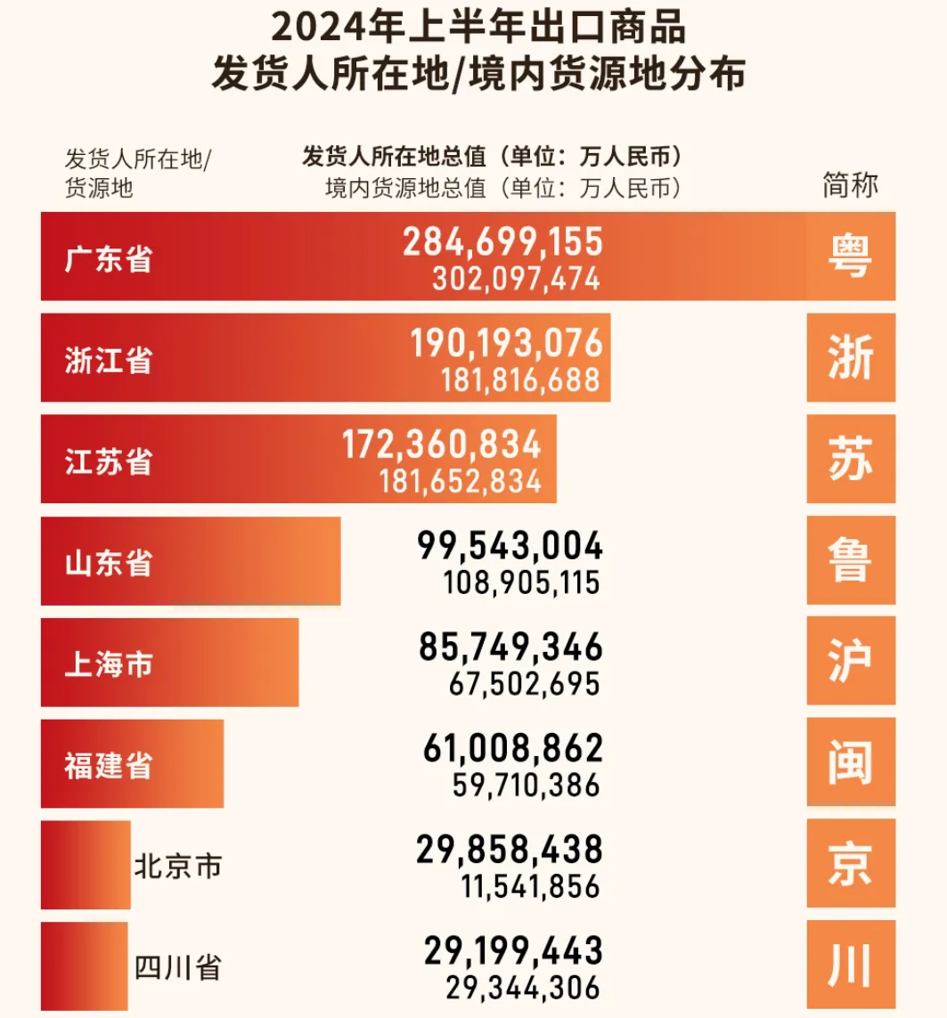 广东、浙江和江苏三省上半年的出口总值,合计占据了超过二分之一的总出口额。其中,在出口商品的发货所在地总值、境内货源地总值这两项数据上,广东省均排名第一。可以看出,得益于便利的交通条件和加强国际合作的系列开放政策,东部沿海省份的出口表现突出。