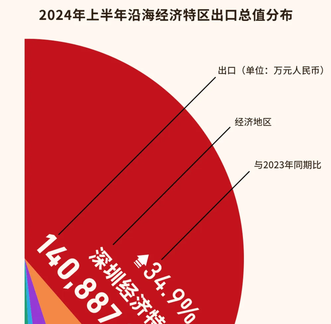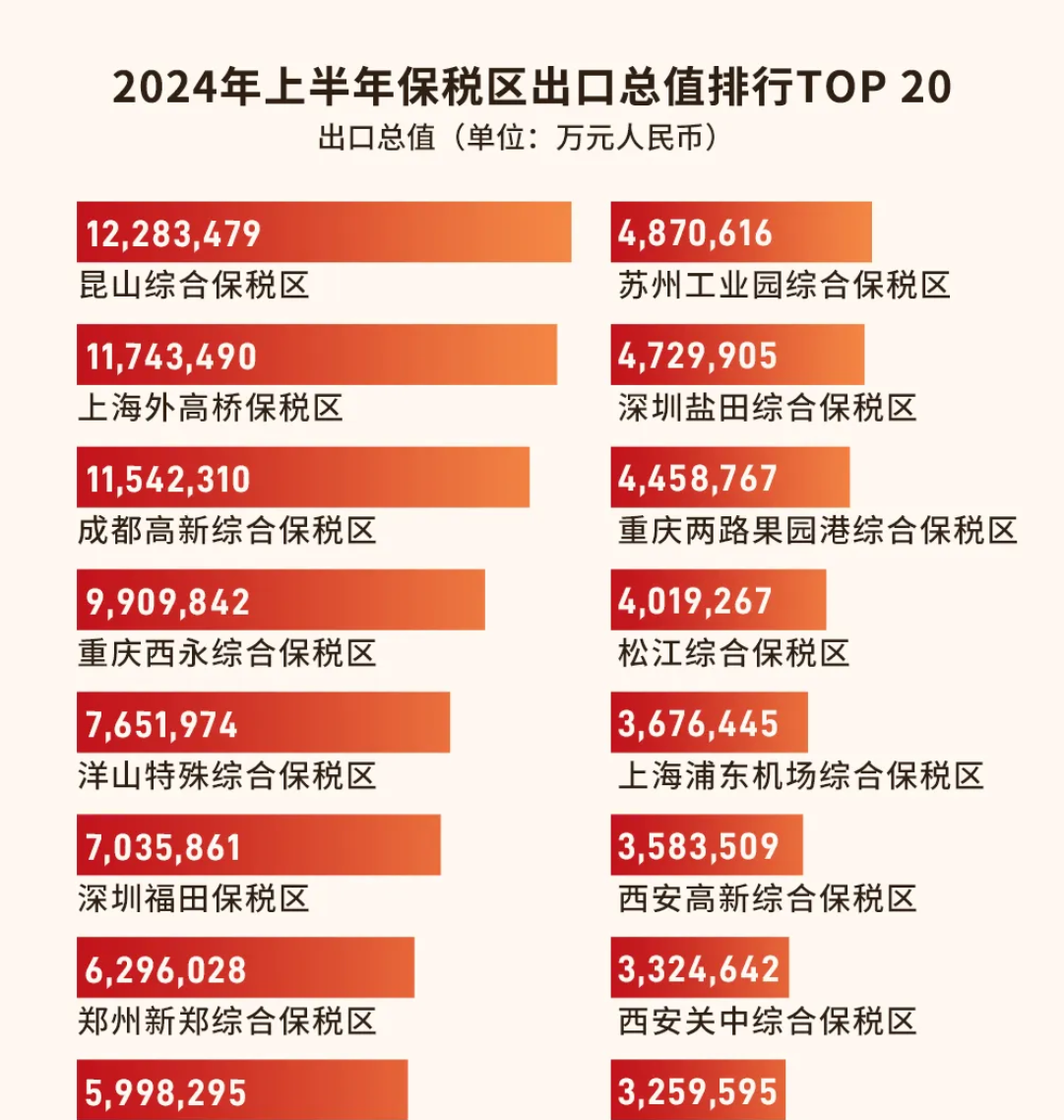 上半年,经济特区整体出口总值与2023年同期相比,上升了27.3%。其中,深圳经济特区以超过1.4万亿元的出口总值,在经济特区中遥遥领先。而保税区的出口竞争比较激烈,昆山综合保税区、上海外高桥保税区、成都高新综合保税区等地均名列前茅。这些出口贸易规模较大的地区,往往拥有相对完善的产业结构和强大的创新能力,才能吸引大量高新技术企业和制造业企业入驻,形成产业集群效应,进而推动货物贸易的提质升级与出口总额的提升。