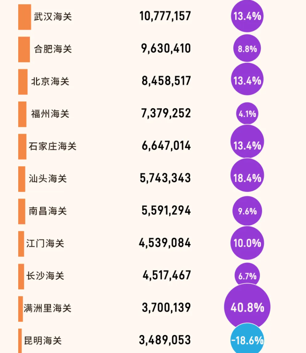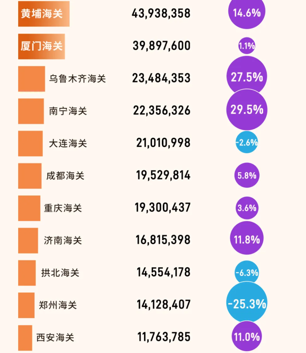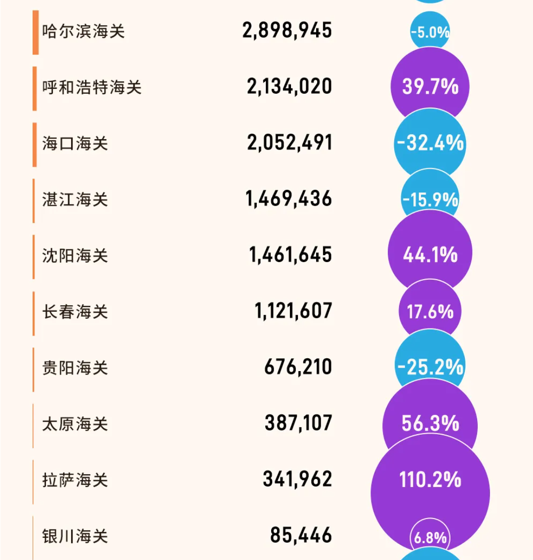 传统的沿海出口强市如上海、深圳在关别总值中排名前列,但一些内陆或西部地区的海关如乌鲁木齐、南宁也位列10名开外,从中呈现出中国出口市场向多元化、均衡化发展的趋势也可见推进“一带一路”倡议对沿线国家贸易往来的重要作用。