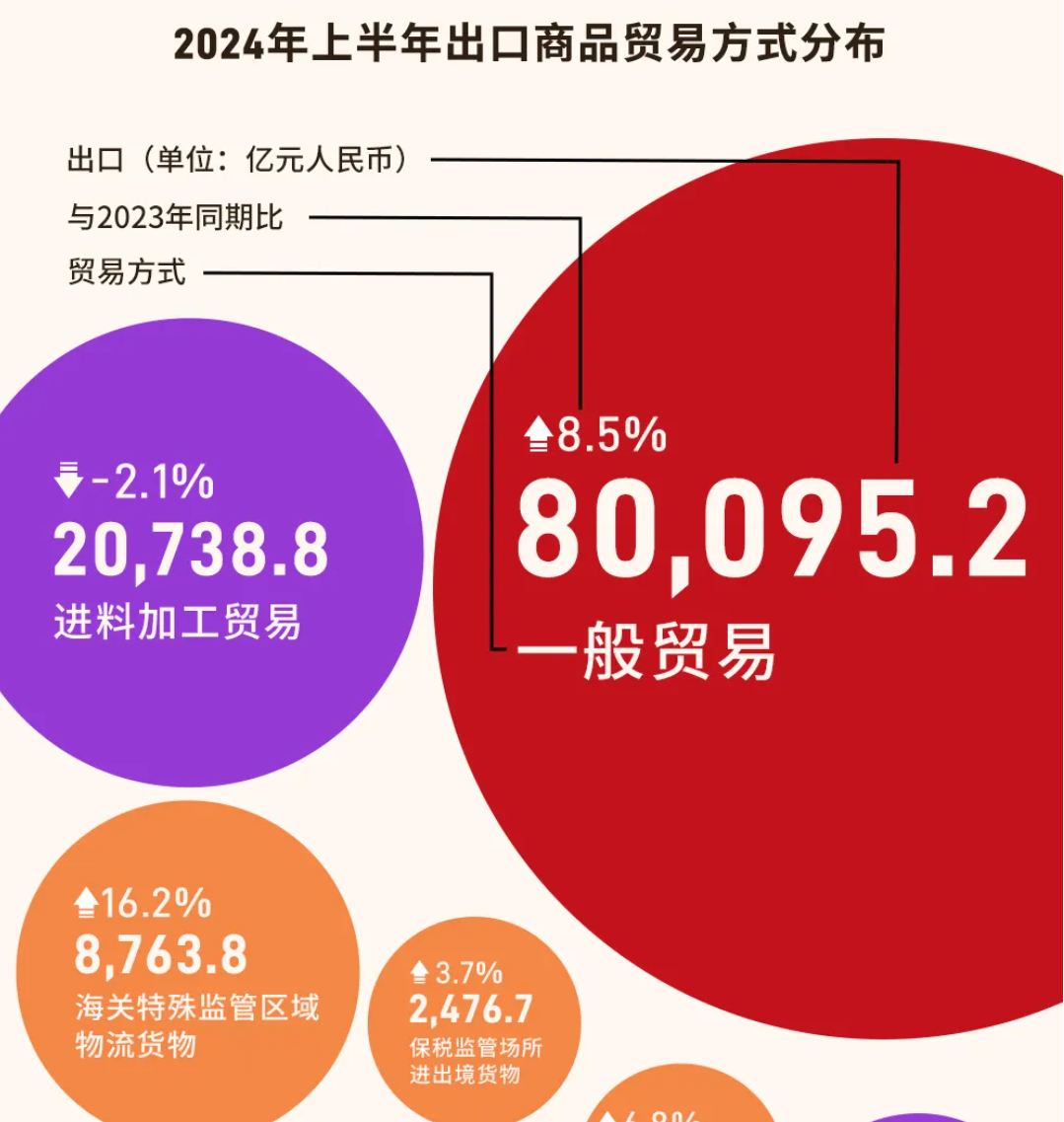 上半年,进料加工贸易仍占据出口一定份额,但呈下降趋势,而一般贸易与2023年同期对比增长8.5%。