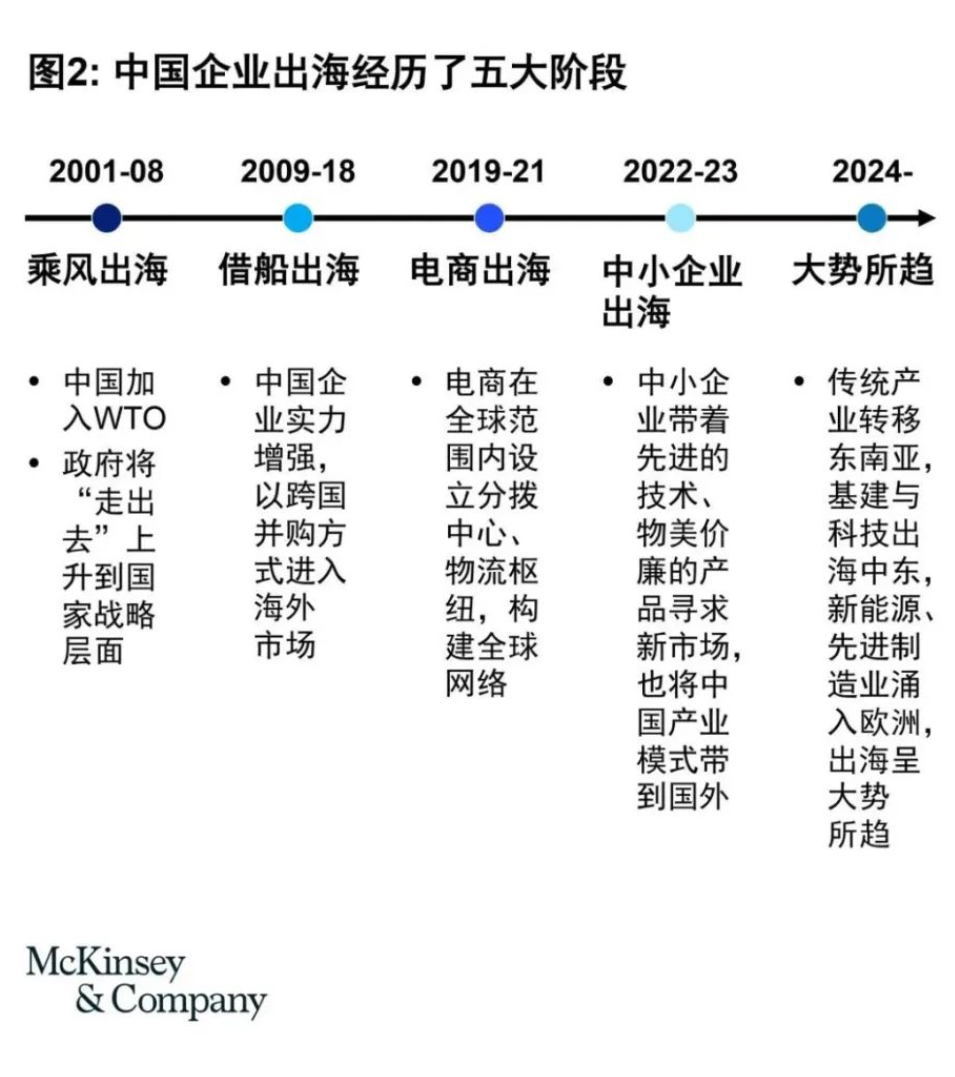 回溯历史,中国企业出海可分为五个阶段(图2)。2001-2010年是中国企业“乘风出海”的十年。借着加入WTO降低贸易壁垒和“走出去”上升为国家战略的东风,部分领先中国企业开始迈出国际化第一步。第二阶段2011-2018年,众多企业通过并购“借船出海”,加速国际化进程;2019-2021年是“电商出海”集中年,众多互联网公司在全球范围设立分拨中心、物流枢纽等,打造全球化竞争优势和业务布局;2022-2023年越来越多中小企业通过互联网和平台化工具进入国际市场;而到2024年,中国企业走向世界已呈大势所趋。