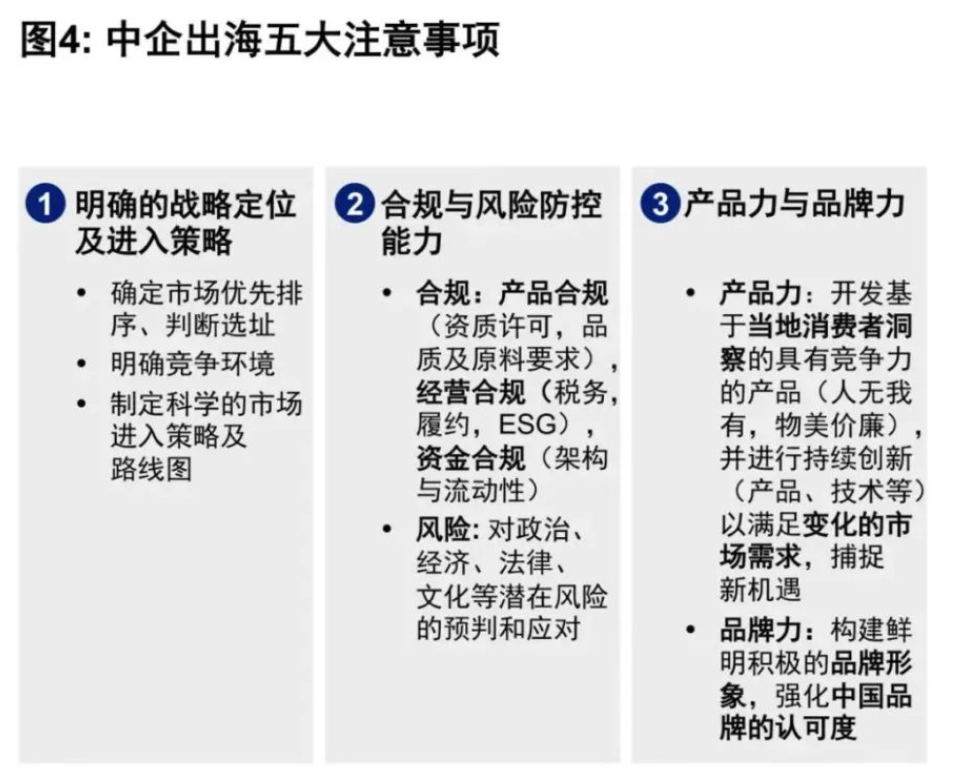 因此我们认为在中国企业出海的过程中,有五大注意事项:包括明确的战略定位及进入策略,产品、经营、资金合规及全方位风险预判和应对,强大的产品力与品牌力,本土人才管理能力及组织配套,以及本土生态圈融入与调动能力(图4)