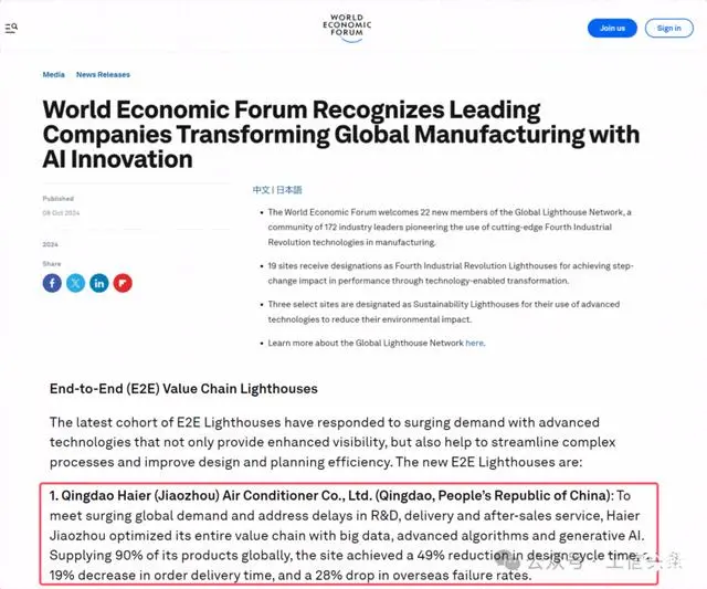 世界经济论坛公布第12批灯塔工厂入选名单,22家新灯塔工厂入选灯塔网络,全球灯塔数量升至172家。在卡奥斯COSMOPlat工业互联网平台领先科技加持下,海尔胶州空调互联工厂成功入选,获评端到端(E2E)价值链灯塔工厂,成为本批次端到端灯塔工厂的唯一中国本土企业。