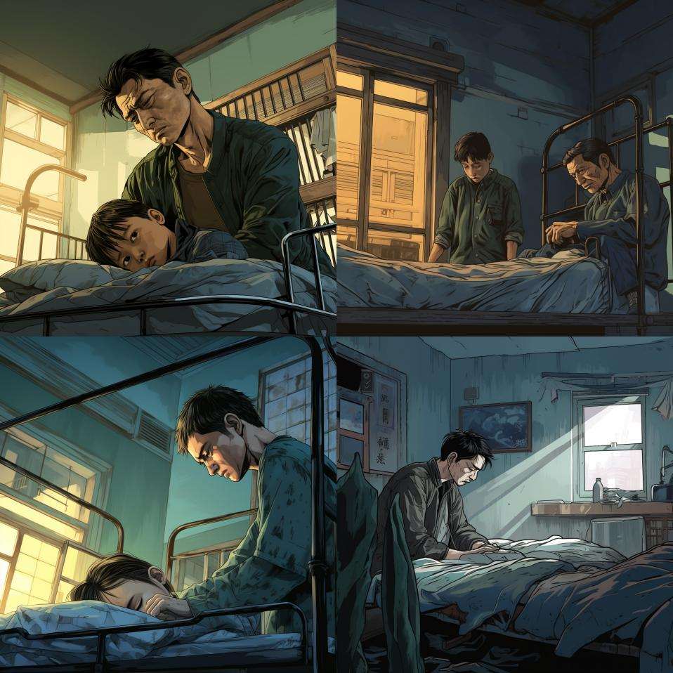 阿雯向我们介绍了当时她用AI来生成绘本的一幕。在喂给AI一些画好的分幕后,她输入“绘本一幕、小孩卧在病入膏肓的父亲面前、民国连环画画风”的关键词组。“我脑海里想的就是生动又朴素的黑白淡彩连环画嘛,那种老画家手迹的感觉,” 阿雯回忆道,“但它生成的还是偏游戏原画的那种。”