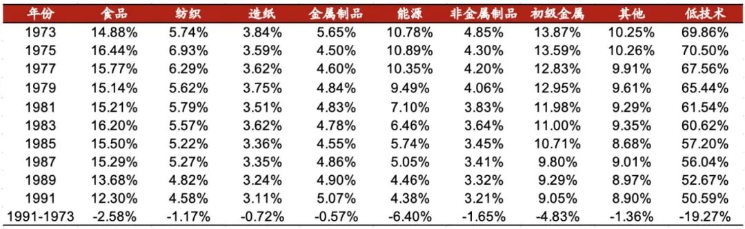 日本制造业中低技术产业生产总值结构变动(1973-1991)