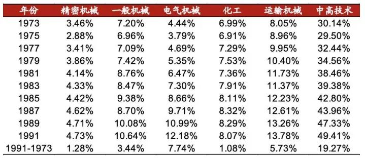 在此背景下,日本政府于1971年发布《70年代产业结构设想》,提出调整产业结构,缩减大量消耗能源、高污染、高公害的资本密集度高的重化工业和衰退产业,同时培养新兴产业,产业结构向消耗能源少、附加产值高的知识技术密集型的加工工业转换,电子计算机、集成电路等高精度组装加工产业成为重点扶持对象。1976-1991年间,日本中高技术制造业产值比重年均以1%-3%的不同幅度提高,到1991年,日本中高技术制造业产值比重为49.41%,相比1973年提高了19.27个百分点。