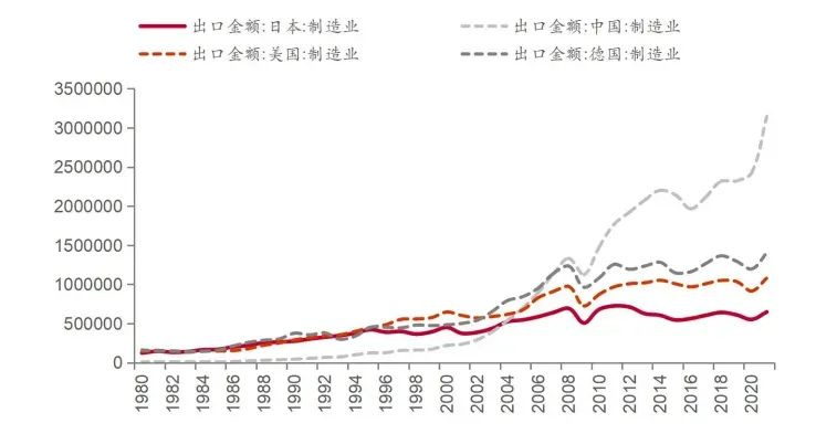 90年代后日本制造业出口与中美德差距拉大(百万美元)