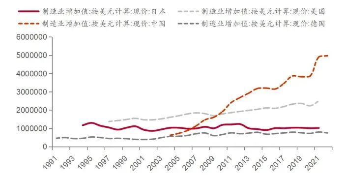 90年代后日本制造业增加值与中美差距逐渐拉大(百万美元)