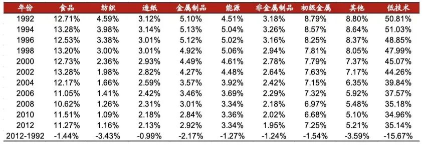 日本制造业中低技术产业生产总值结构变动(1992-2012)