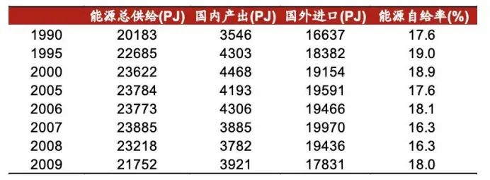 1990-2009年日本能源自给率推移