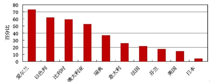 OECD成员国海外子公司的商业研发支出占国内研发支出比重(%)