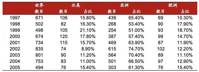 日本新建海外分支机构数量及分布(单位:个,%)