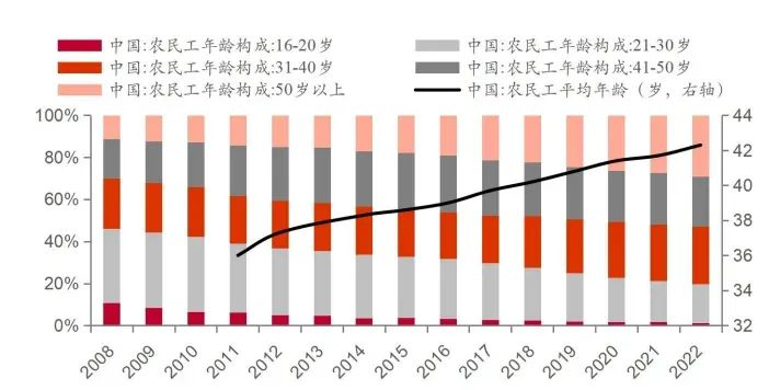中国农民工平均年龄已由2011年的36岁上升至2022年的42.3岁