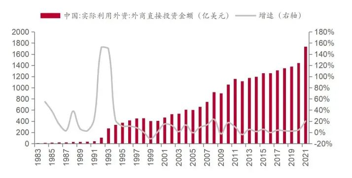 1983-2021年中国实际利用外商直接投资稳步增长