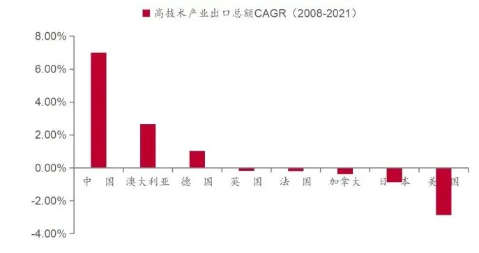 2008-2021年中国高技术产业出口额CAGR高于主要发达国家