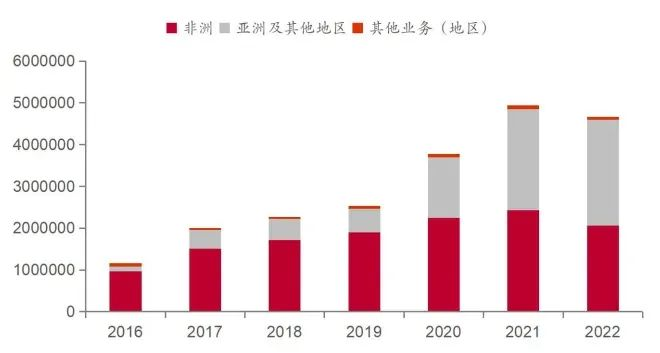 2016-2022年传音控股按地区营收分布情况