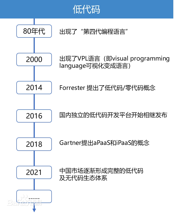 Gartner随后又提出了aPaaS和iPaaS的概念,其中aPaaS概念和低代码非常吻合。随着这一概念的不断推广,全球市场上都涌现出了很多低代码平台。