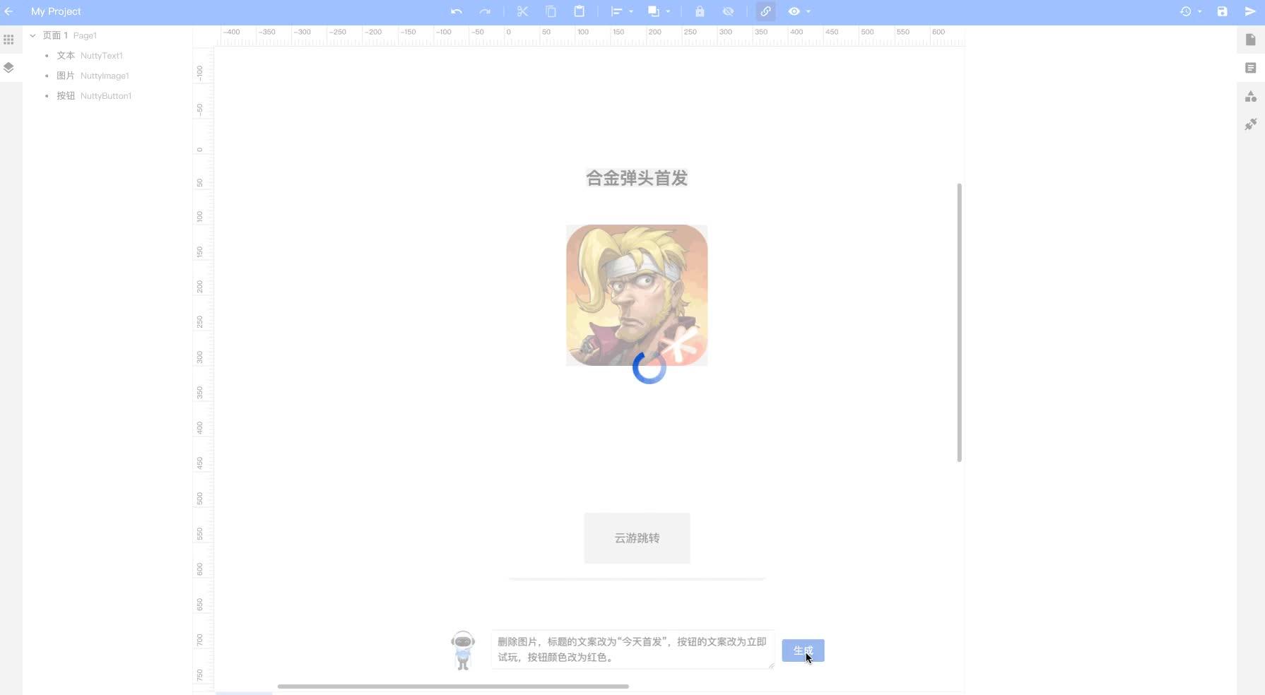 eg1: 页面生成 & 布局能力。需求:页面分为三部分,顶部是标题”合金弹头首发”,中间是一张图片,图片链接是”<a href=”https://cdn.yyb.gtimg.com/co-page-img/game-icon.png”> https://cdn.yyb.gtimg.com/co-page-img/game-icon.png “,底部是一个按钮,按钮文案是云游跳转。